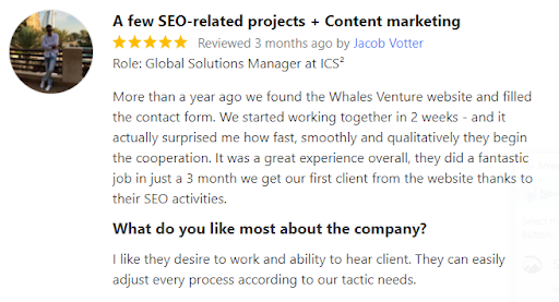 The differentiating factor for Whales Venture is that they have a dynamic team of varying interests and personalities. This means some result-oriented SEO services come from them as well. Jacob Votter, the Global Solutions Manager at ICS², gave a 5-star rating to Whales Ventures and applauded them for their fast, smooth, and cooperative approach to work.